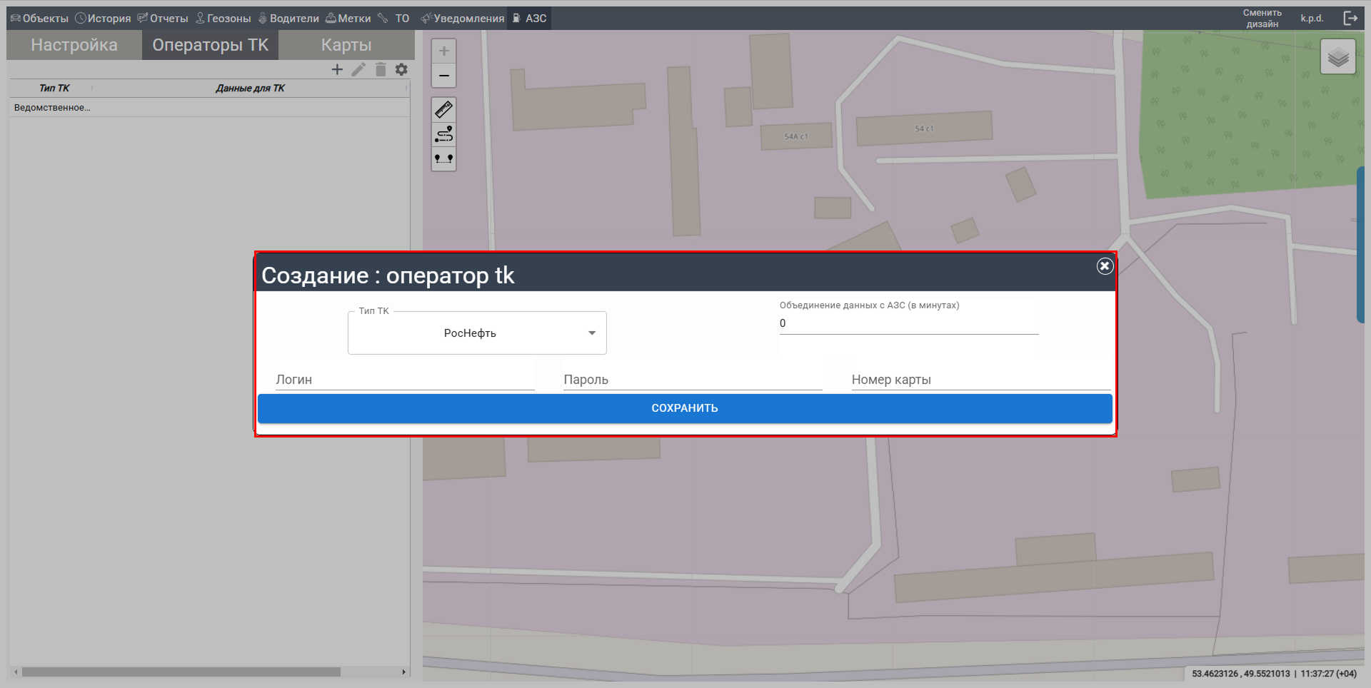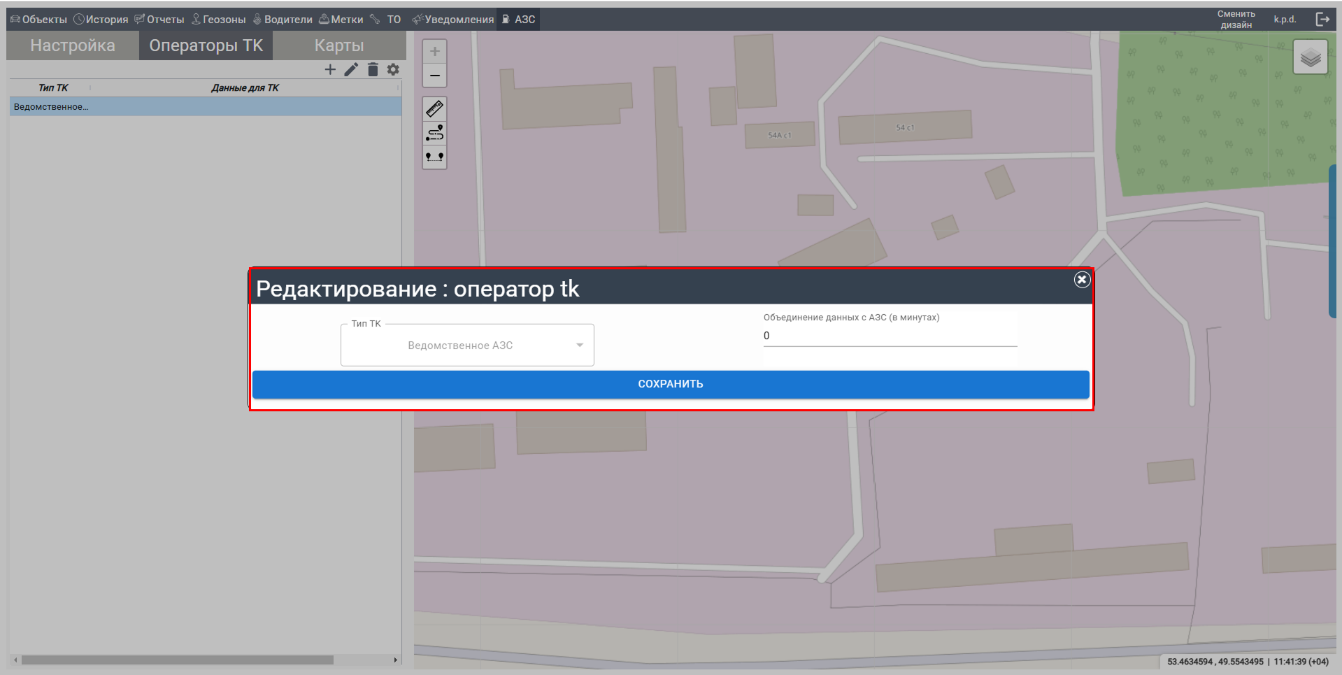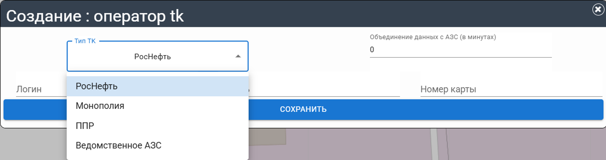 В выпадающем списке "Операторы ТК" выберите нужного оператора (АЗС).