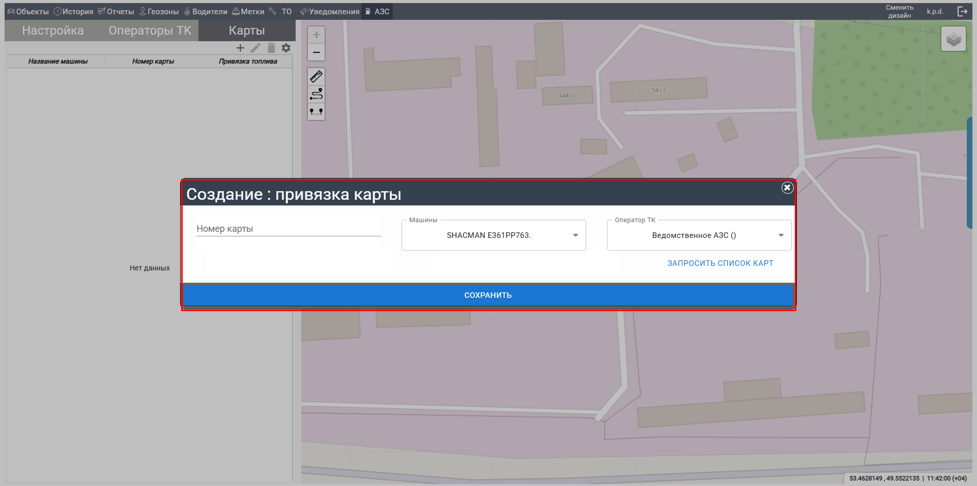 В секции "Карты" вы можете привязывать топливные карты к объектам, таким как автомобили в вашем автопарке.
