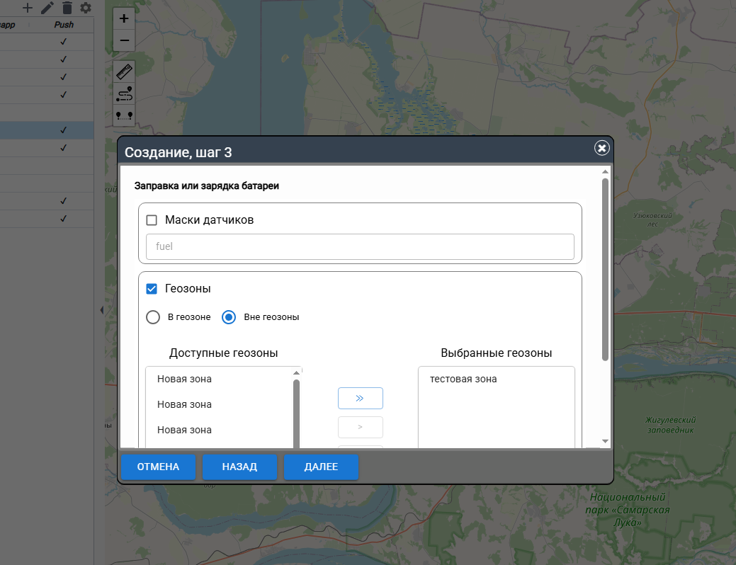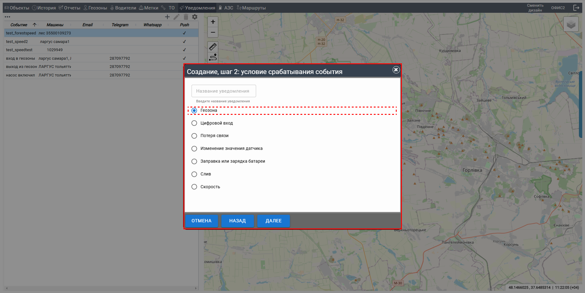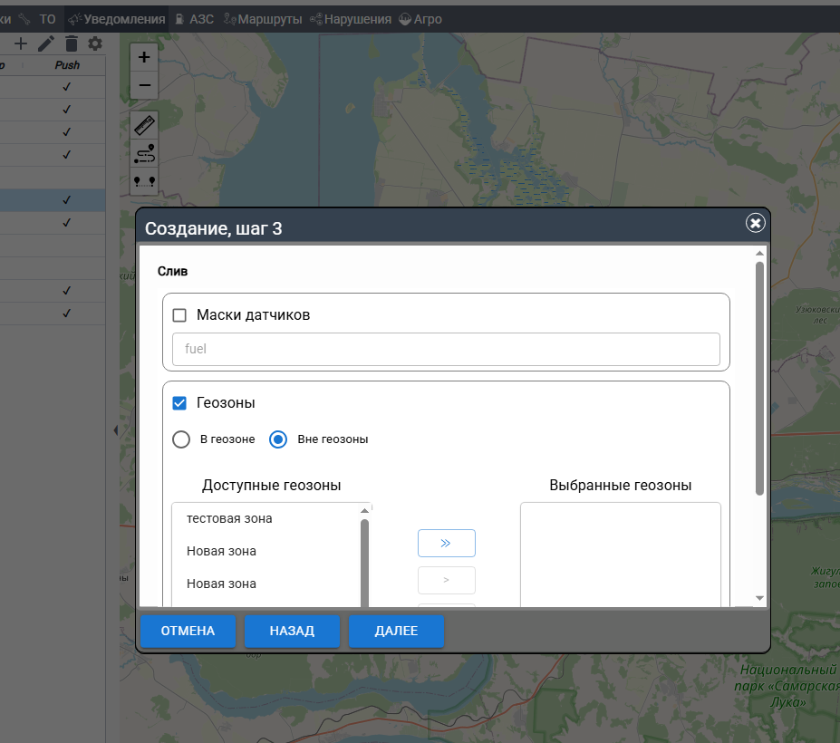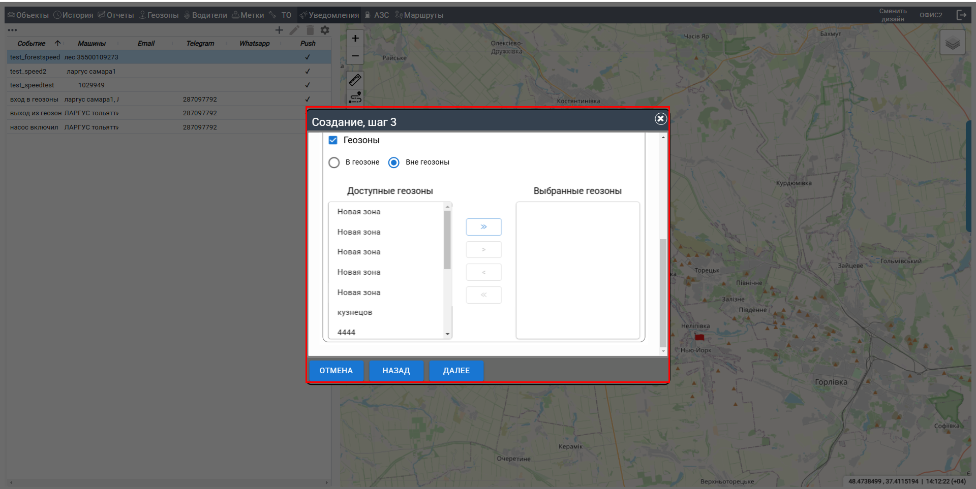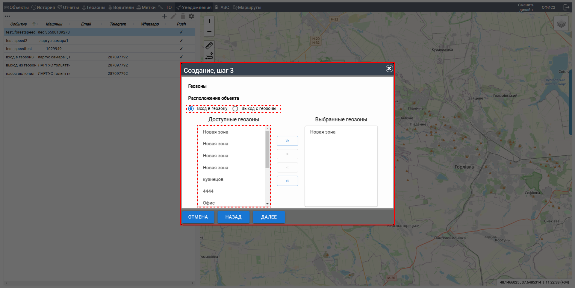 Если поставить галочку в поле “Геозоны”, то будут учитываться геозоны. При установке галочки в поле “Вне геозоны”, то уведомление сработает только тогда, когда объект будет находиться вне геозоны, а в случае “В геозоне” событие сработает только когда объект будет внутри выбранной геозоны.