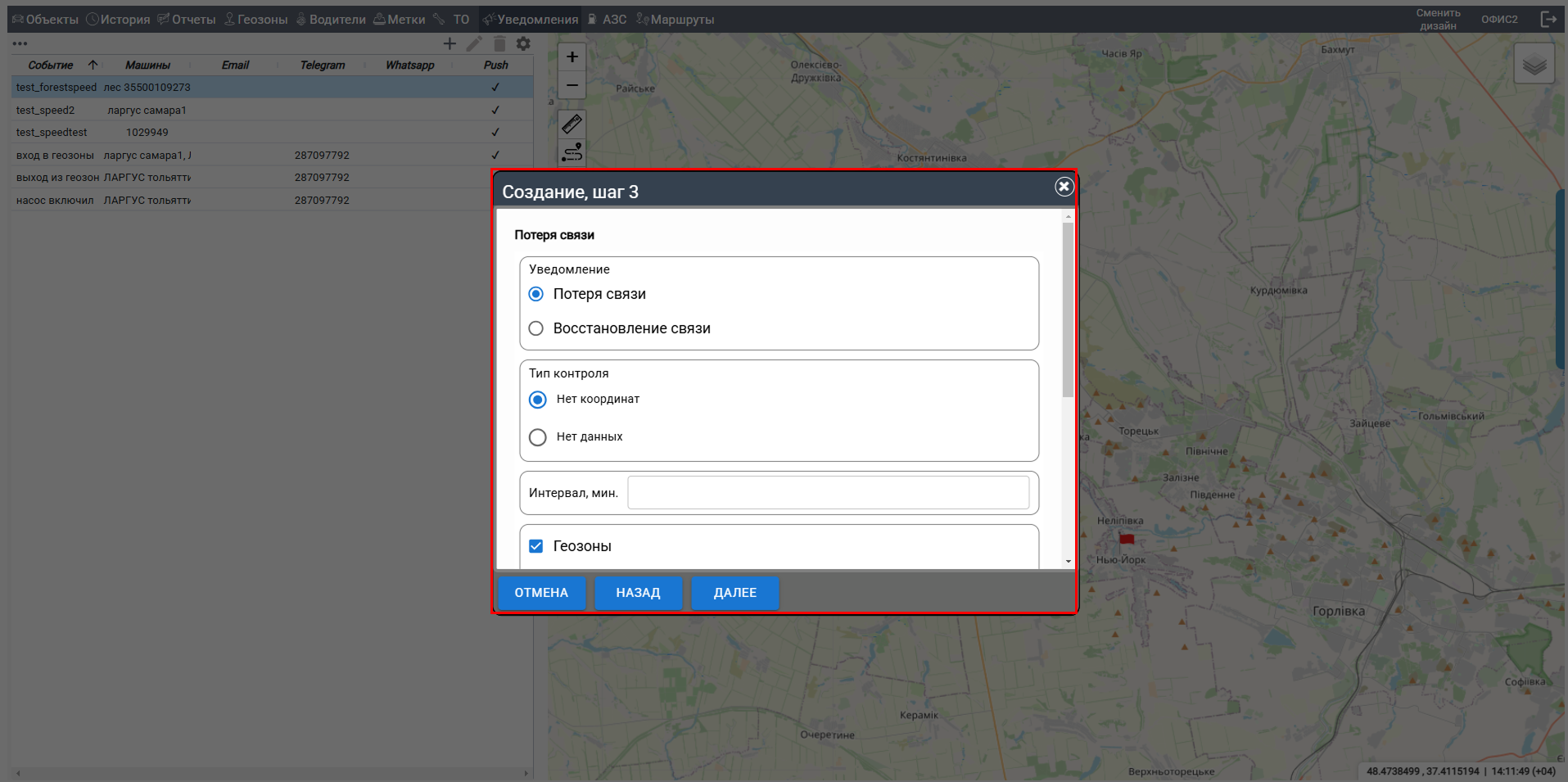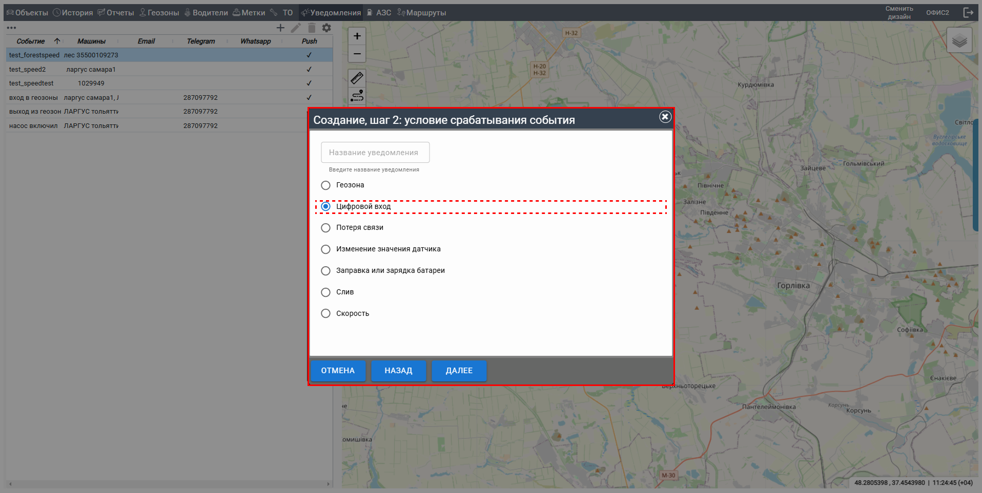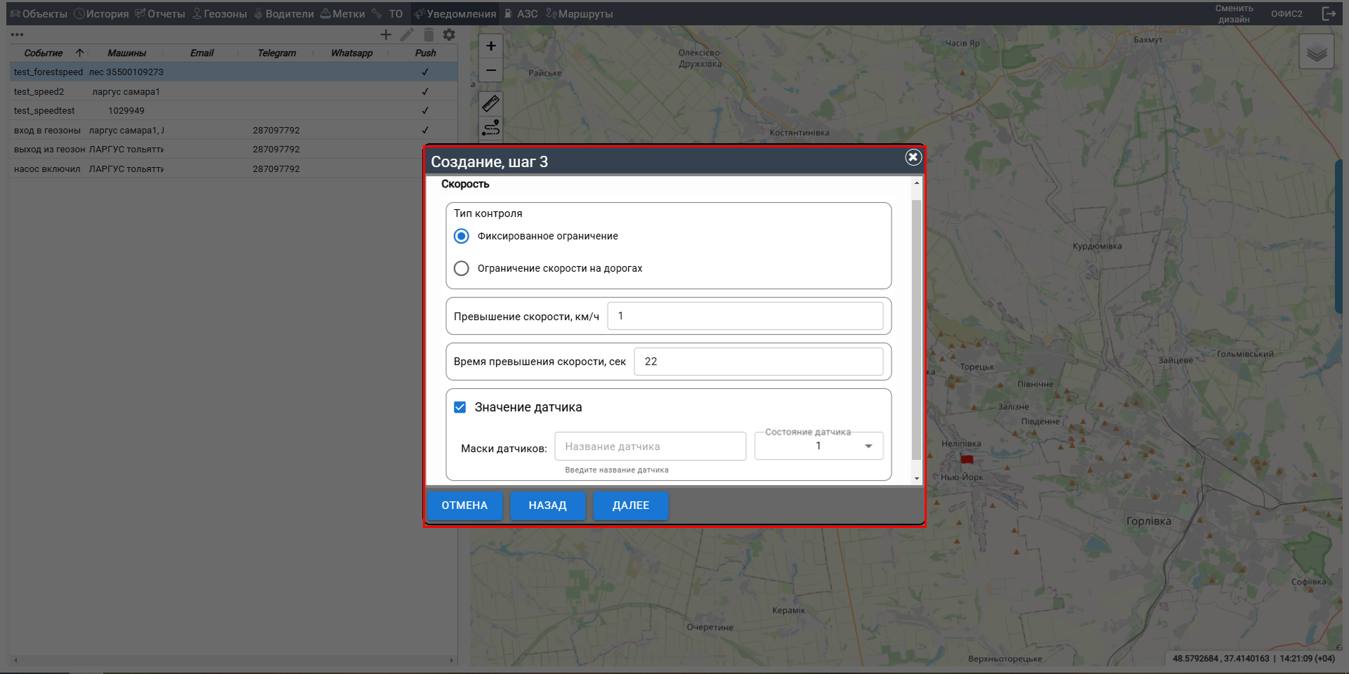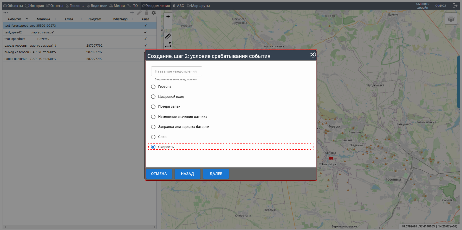 Если поставить галочку в поле “Геозоны”, то будут учитываться геозоны. При установке галочки в поле “Вне геозоны”, то уведомление сработает только тогда, когда объект будет находиться вне геозоны, а в случае “В геозоне” событие сработает только когда объект будет внутри выбранной геозоны.