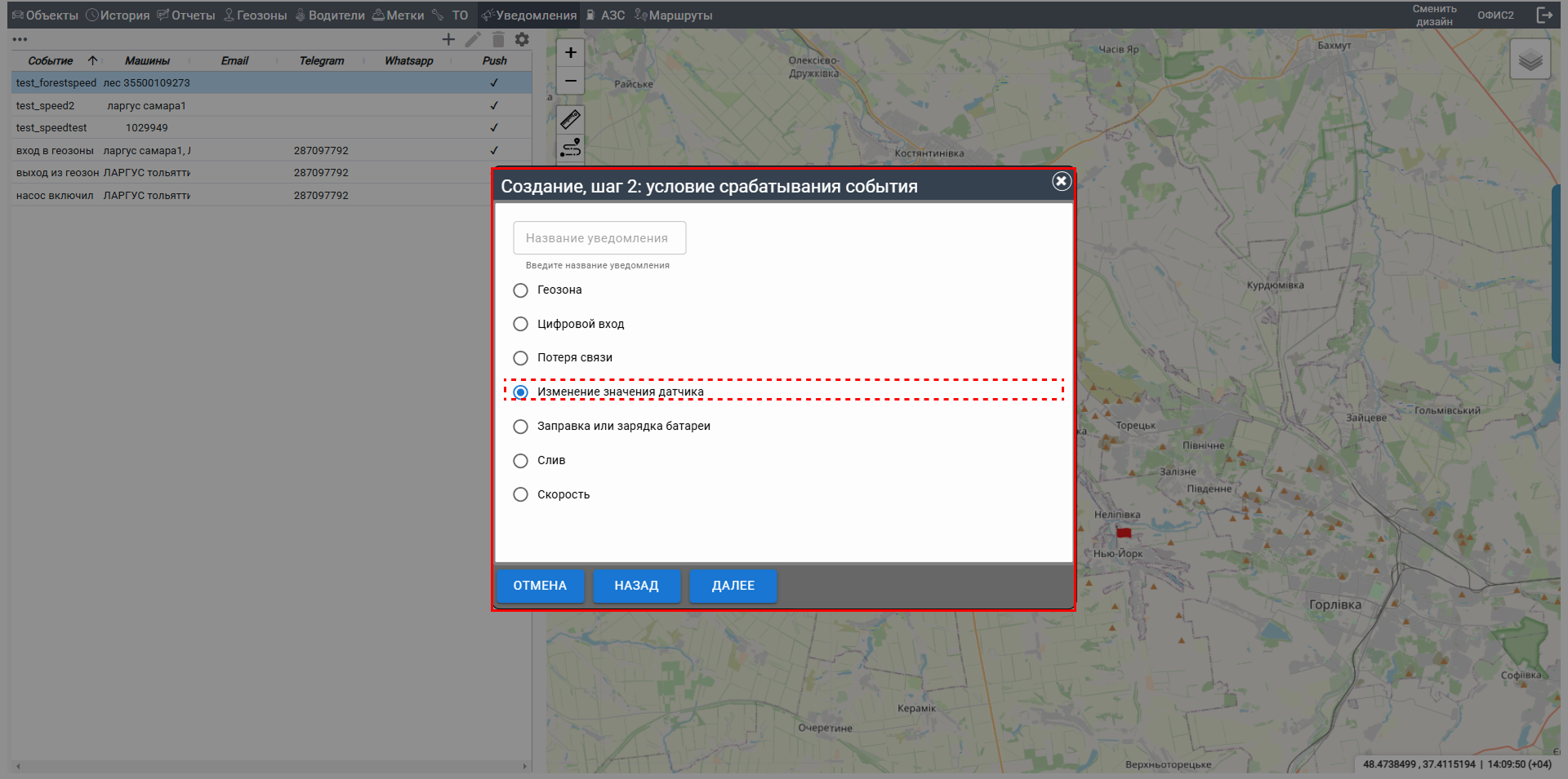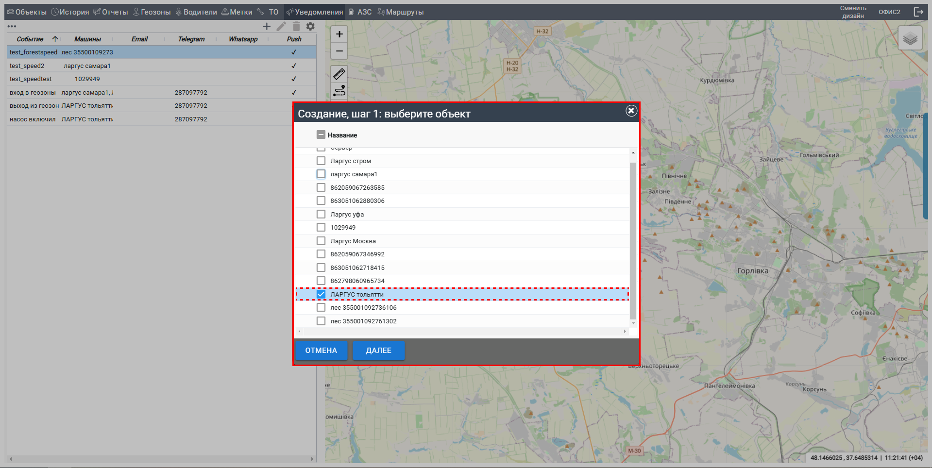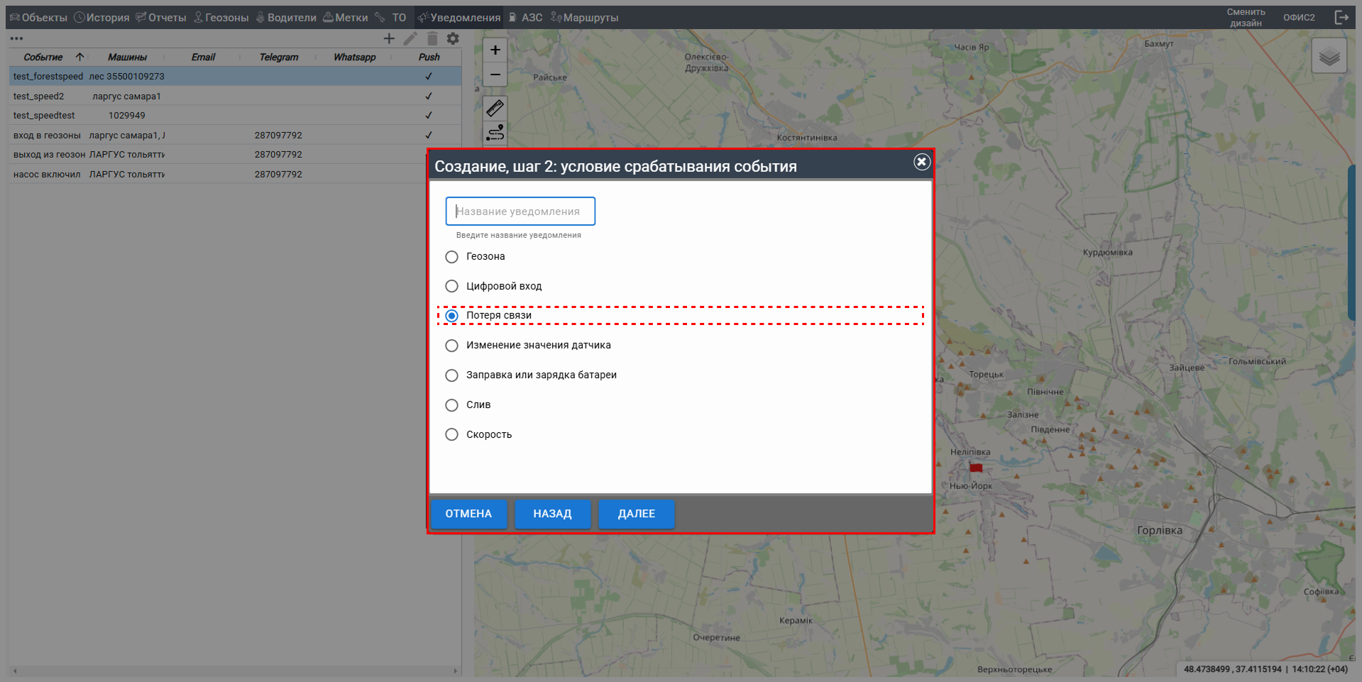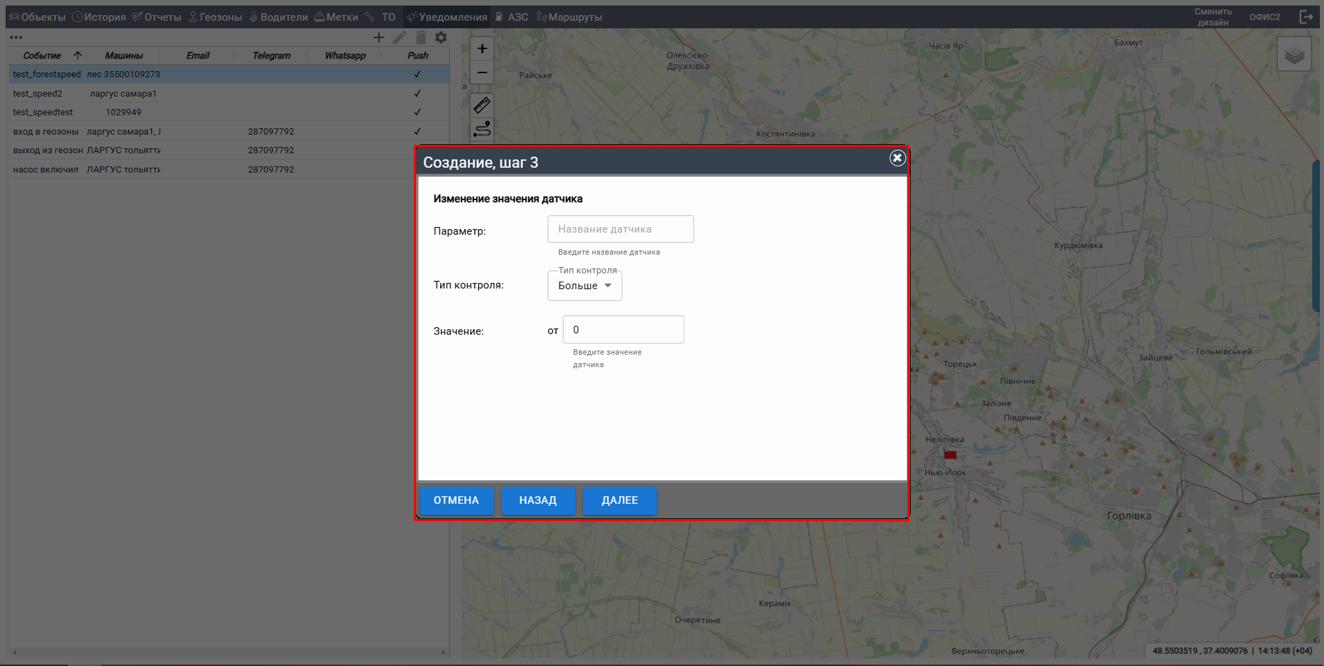 Если поставить галочку в поле “Геозоны”, то будут учитываться геозоны. При установке галочки в поле “Вне геозоны”, то уведомление сработает только тогда, когда объект будет находиться вне геозоны, а в случае “В геозоне” событие сработает только когда объект будет внутри выбранной геозоны.