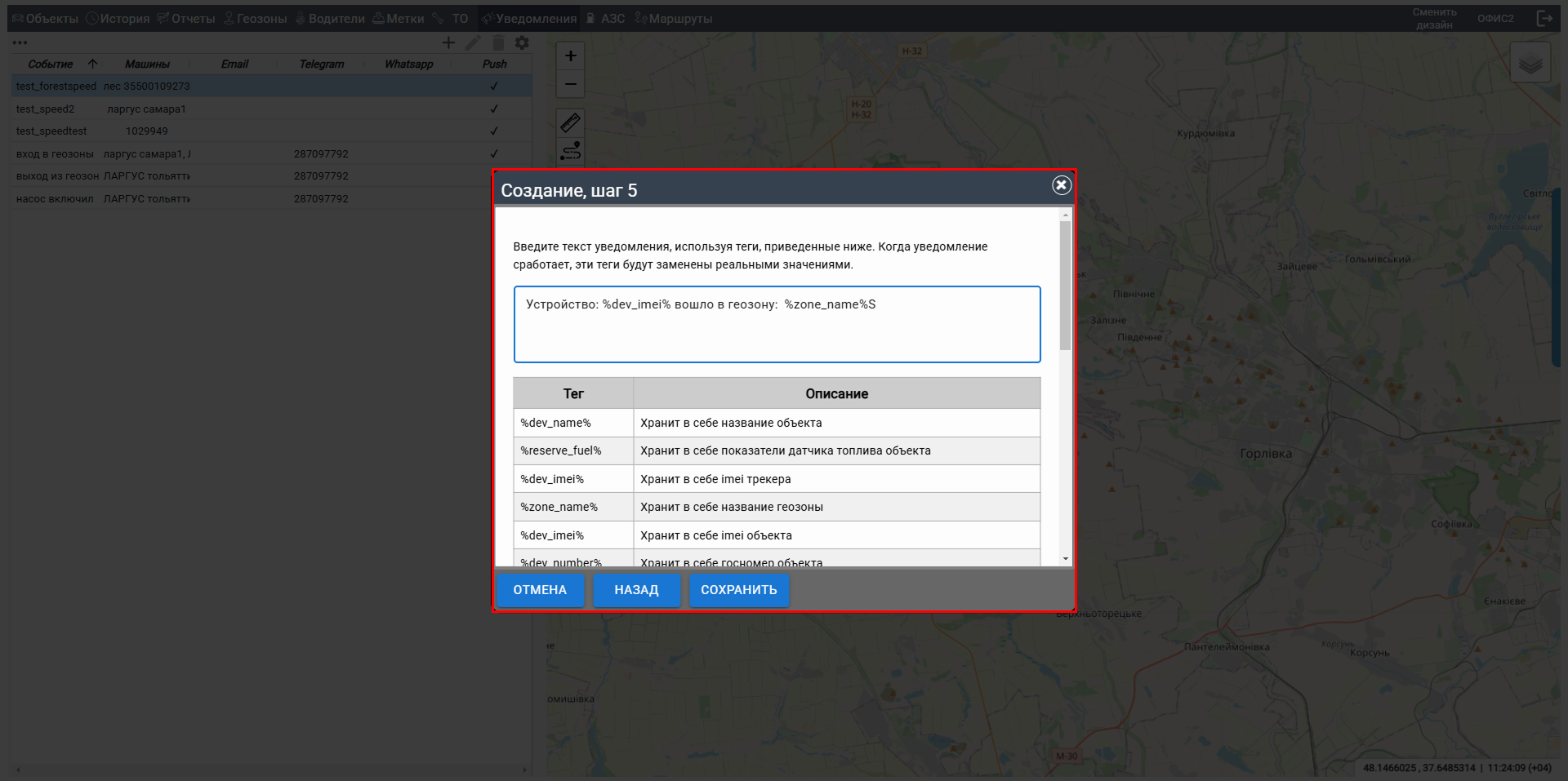 | %lat% | Географическая широта в момент срабатывания уведомления |